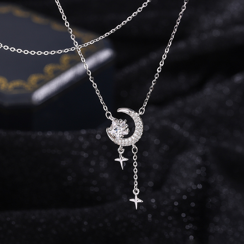 Pure Silver 999 Romantic Star Necklace for Women, Ins-Style Sparkling Starry Sky Tassel Star and Moon Clavicle Chain, High-End Fashion Jewelry