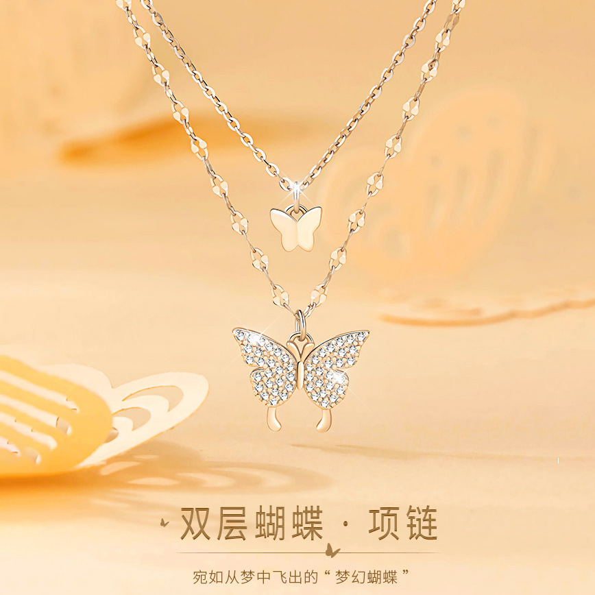 S999 Pure Silver Butterfly Necklace Women's Double Layer Stacked Sterling Silver Pendant Accessible Luxury Niche Design Clavicle Chain Necklace Gift