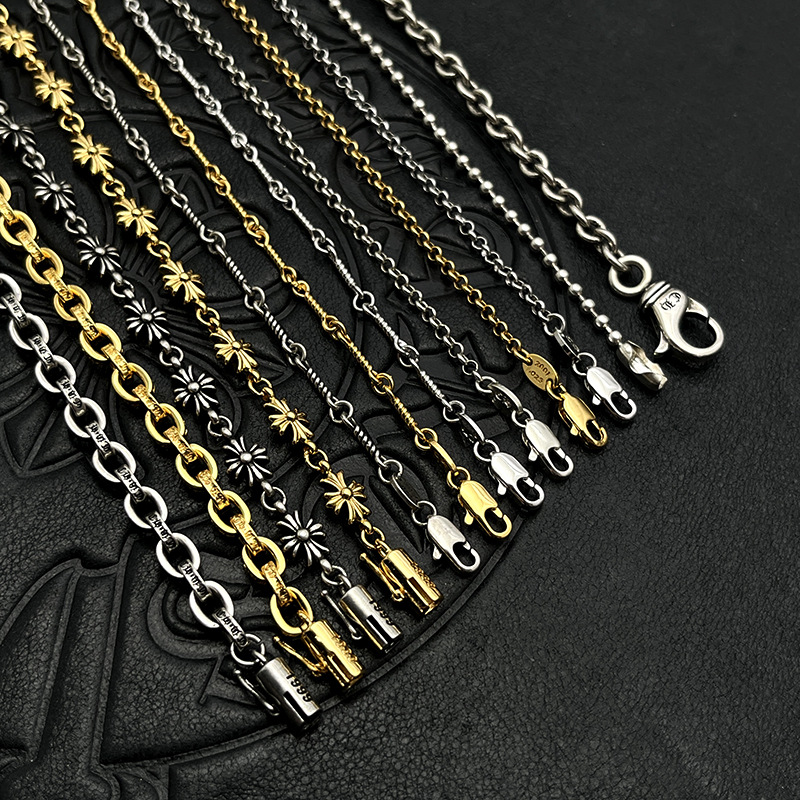 Collection of Single Chain Jewelry: Thai Silver Vintage Sweater Chain, Thick Letter Chain, Cross Chain, Thin Pearl Chain, Round Bead Chain, Braided Chain