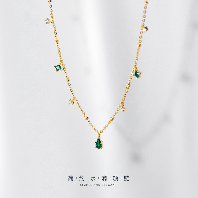 S925 Silver Necklace Female Geometric Square Green Water Drop Green Diamond Small Fresh Ins Niche Stacked Clavicle Chain D7427