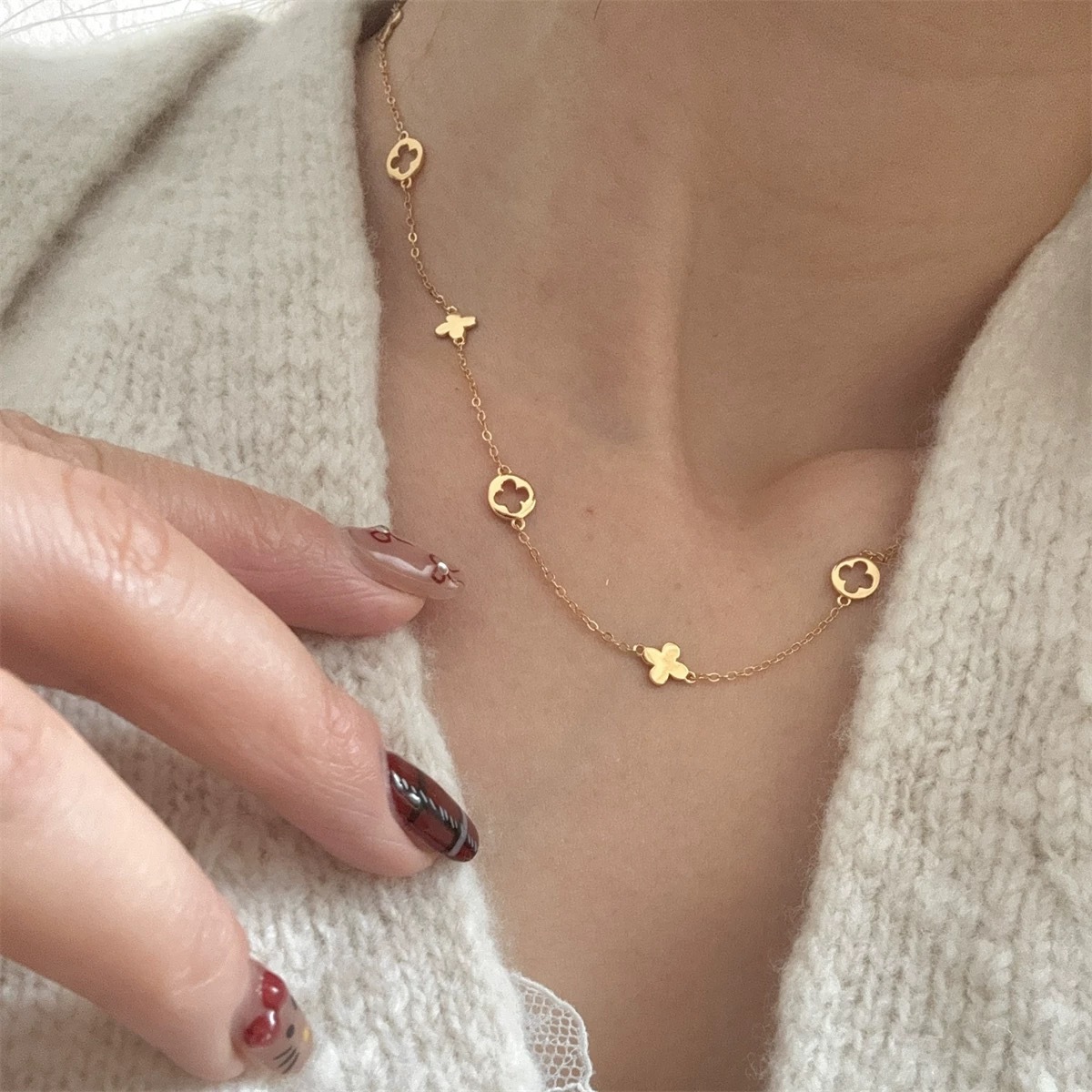 Korean Version 925 Sterling Silver Plated with 18K Gold Single-Layer Hollow Four-Leaf Clover Clavicle Chain Sweet and Fresh Four-Leaf Clover Necklace