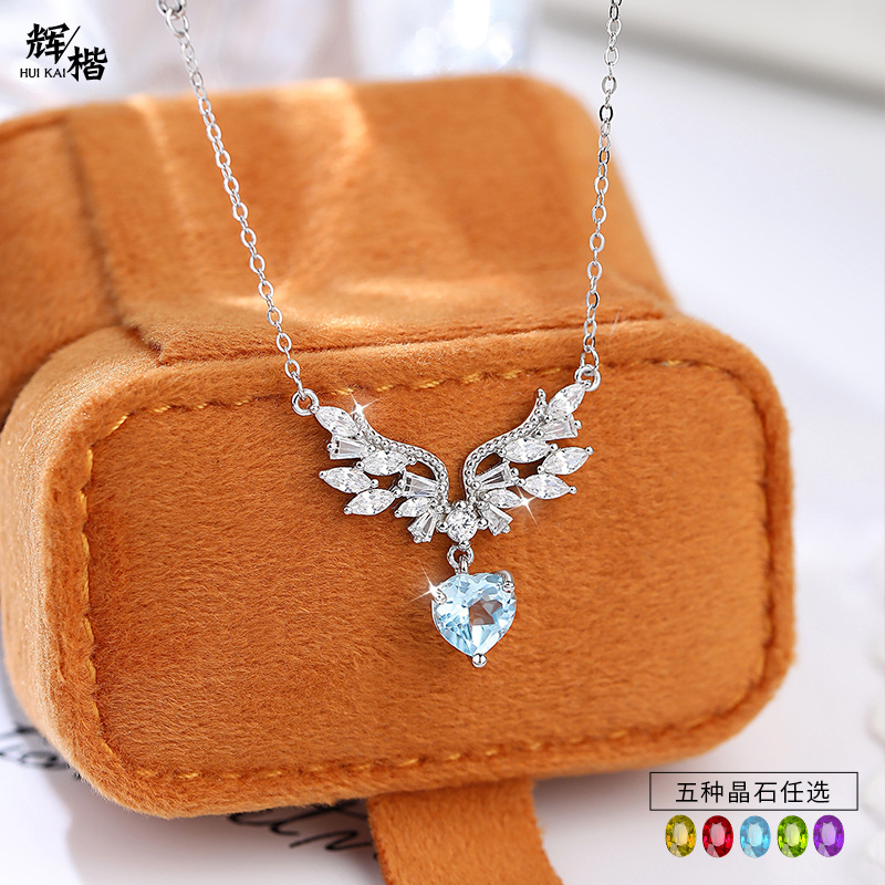 Original S925 Sterling Silver Angel Wings Necklace Korean Style Natural Crystal High-grade Pendant Fashionable Simple Clavicle Chain for Women