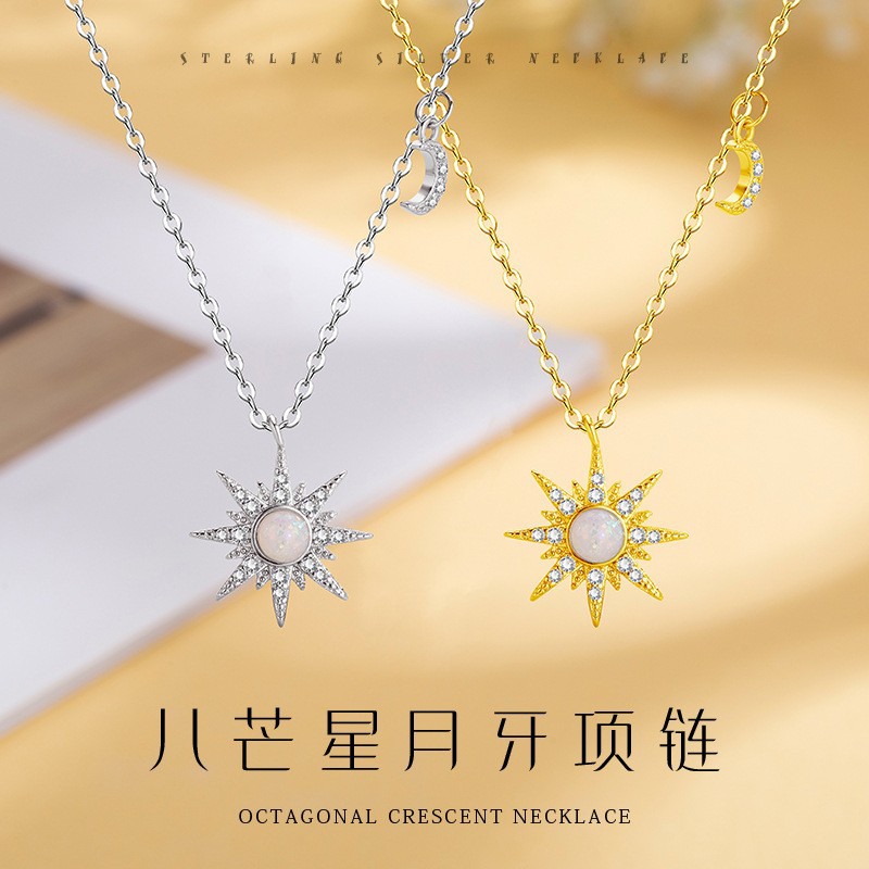 Yinzhen S925 Sterling Silver Eight-Pointed Star Crescent Moon Opal Stone Necklace Women's Simple Niche Design Elegant Clavicle Chain