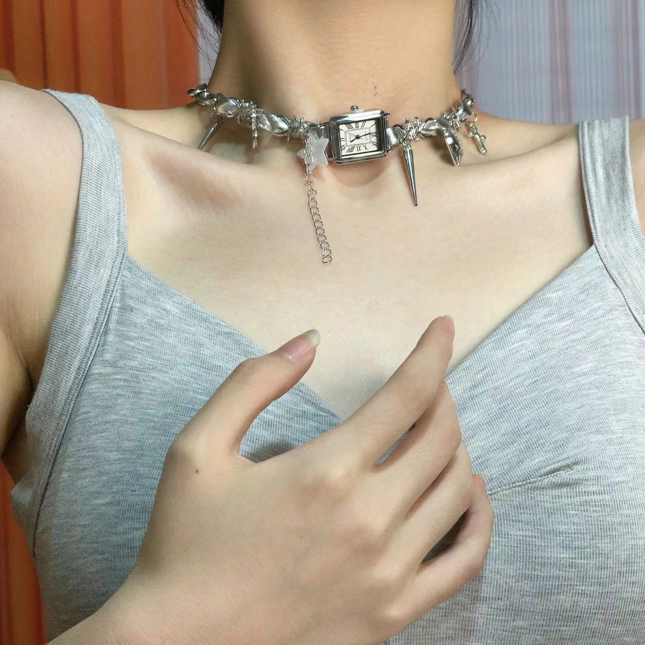 Metal Punk Fashionable Silver Leather Heart Star Clock Necklace Women's Functional Stylish Clavicle Chain Choker Necklace