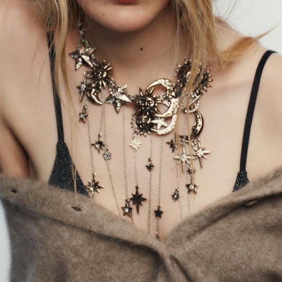 Za Cross-Border European and American Retro Exaggerated Alloy Inlaid Zircon Sun, Moon and Stars Multi-Pendant Tassel Necklace Accessible Luxury and High-End Sense