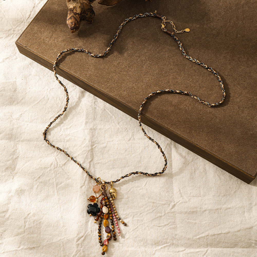 Vintage Handmade Woven Rope Niche Design Natural Stone Tassel Long Sweater Chain Flower Necklace with a High-End Feel for Women