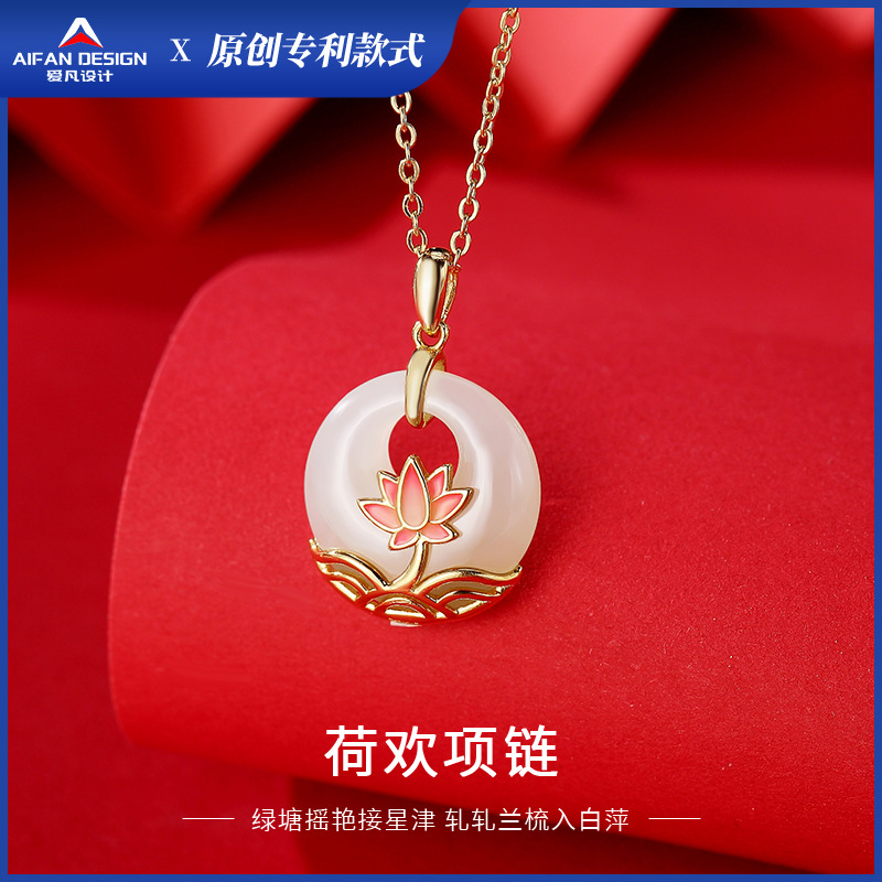 National fashion Hetian jade necklace female s925 sterling silver Lotus pendant Palace style safety buckle Palace style jewelry wholesale