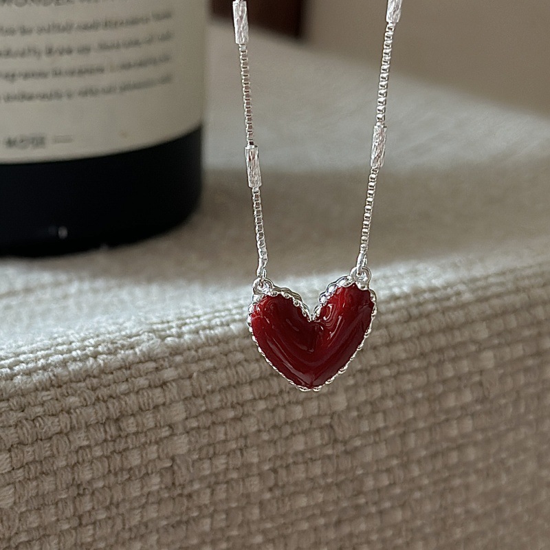 S925 Sterling Silver Korean Style Simple Red Heart Fashion Drip Glaze Necklace Basic New Year Style Clavicle Chain Wholesale