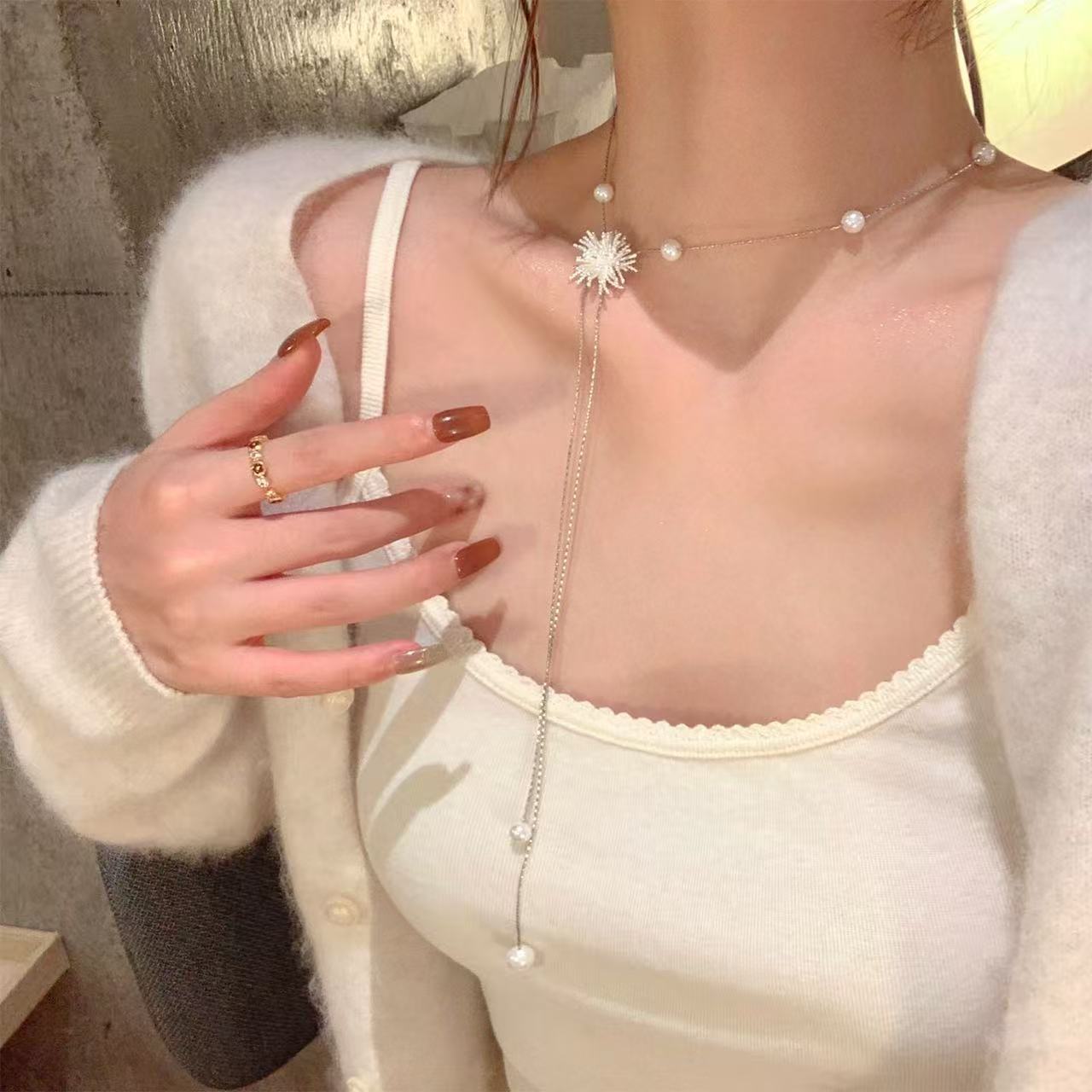 Tiktok Hot Selling Fireworks Pearl Water Drop Pendant Adjustable Necklace Autumn Winter Internet Celebrity Fashion Versatile Sweater Chain
