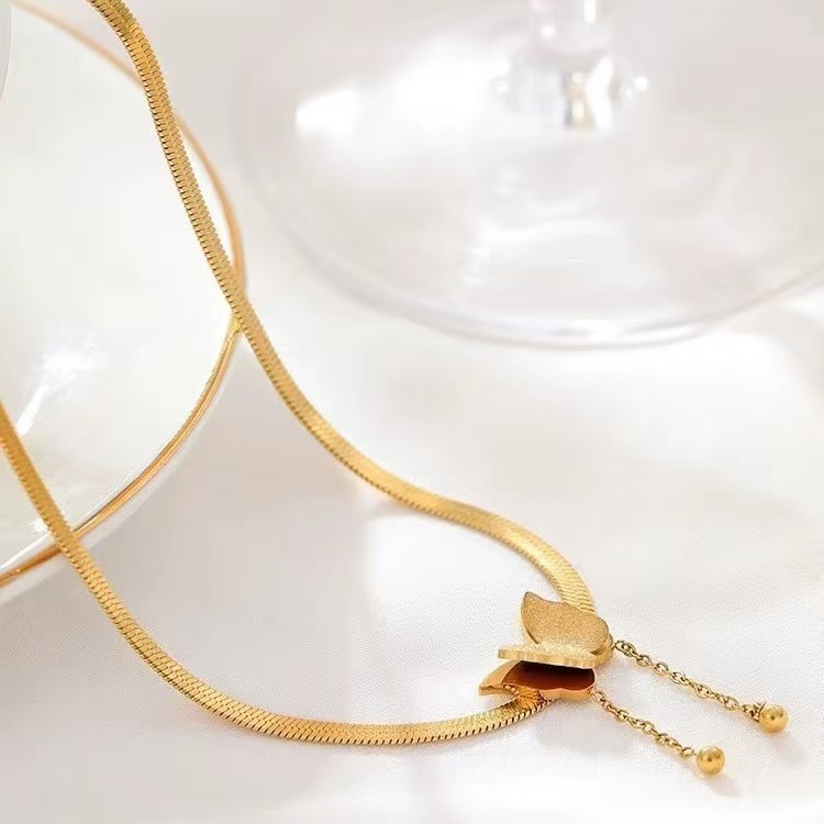 European and American Double Stereo Frosted Tassel Butterfly Necklace Women's Fashion Flat Snake Bone Short Clavicle Chain Color-free Necklace Chain