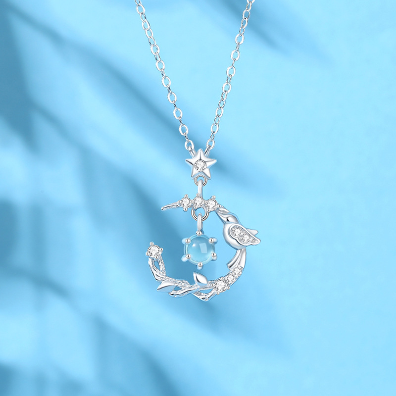 Blue Eucalyptus and Bird Necklace 925 Sterling Silver Trendy Forest Style Light Luxury Niche Simple High-End Original Clavicle Chain Wholesale