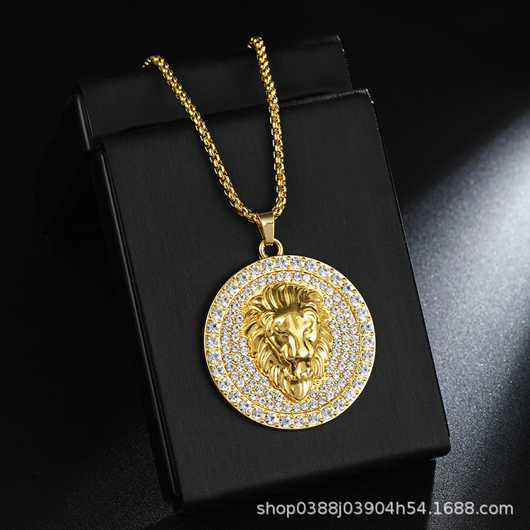 AliExpress Hot Sale Three-Dimensional Diamond Set Disc Lion Head Necklace Trendy Men's Stainless Steel sweater chain Pendant Jewelry