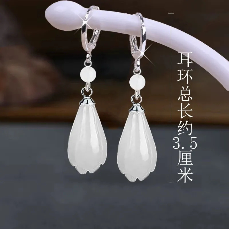 Tourist Attractions Stall Sourcing Chinese Style Vintage Thai Silver Plated Inlay Imitation Hetian Jade Lotus Flower Magnolia Earrings