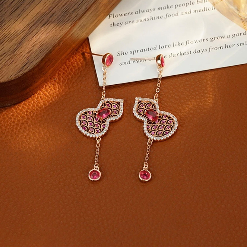 New Chinese Style Rose Gold Rose Red Zircon Gourd Long Tassel Earrings Elegant Retro Light Luxury Earrings