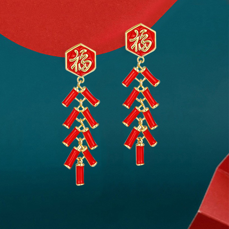 New Year Red Fuzi Firecracker Earrings Women's Unique Personality Design Sense Drop Glaze Tassel Earrings Fashion All-match Earrings