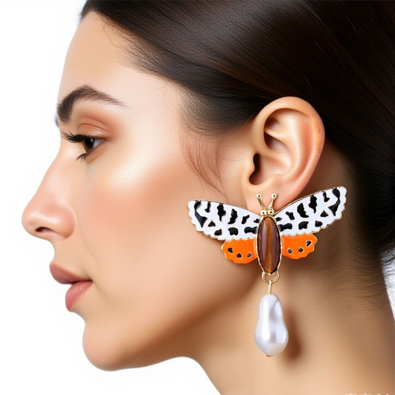 Spanish New Za Colorful Butterfly Earrings with Irregular Faux Pearl Pendants, Oil-Drip Insect Personality Earrings Wholesale Trend