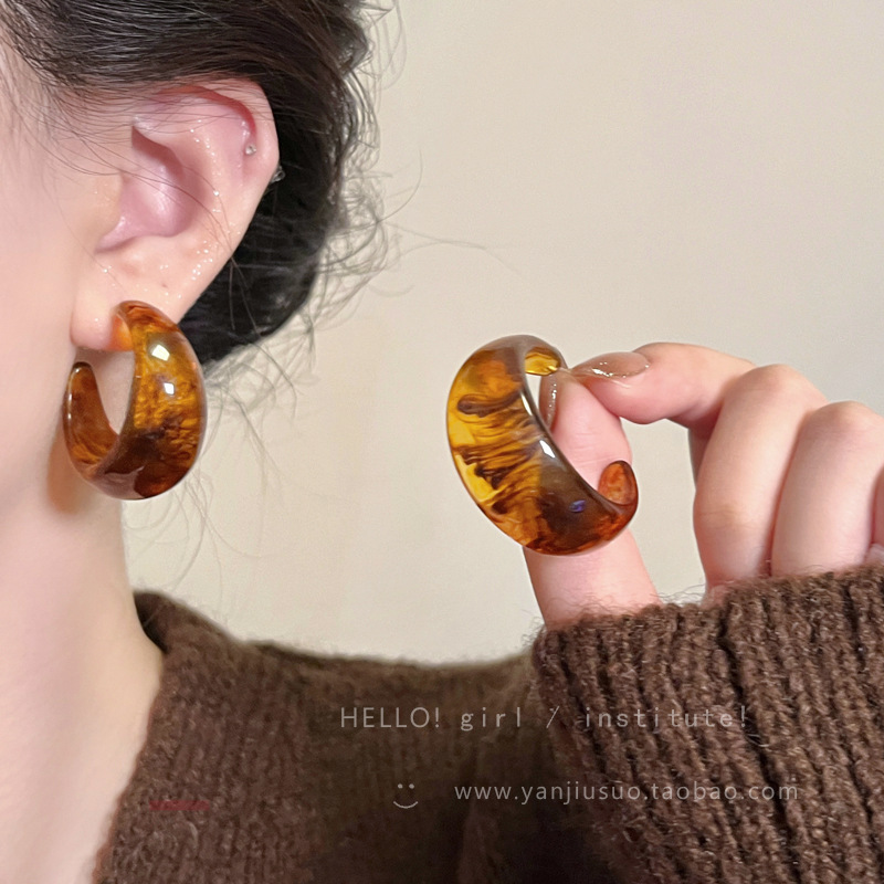 Autumn and Winter Amber Water Drop C-Shaped Earrings for Women Maillard Retro Exaggerated Elegant Earrings Suitable for Round Faces