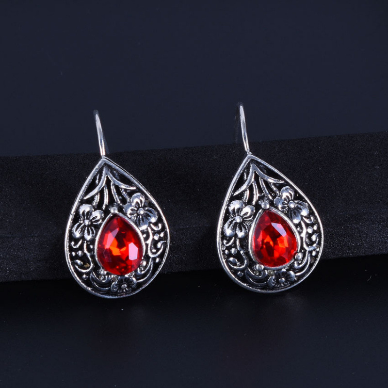 Wish Amazon Hot Selling New Water Drop Pear-Shaped Retro Earrings European and American Thai Silver Carved Ruby Earrings