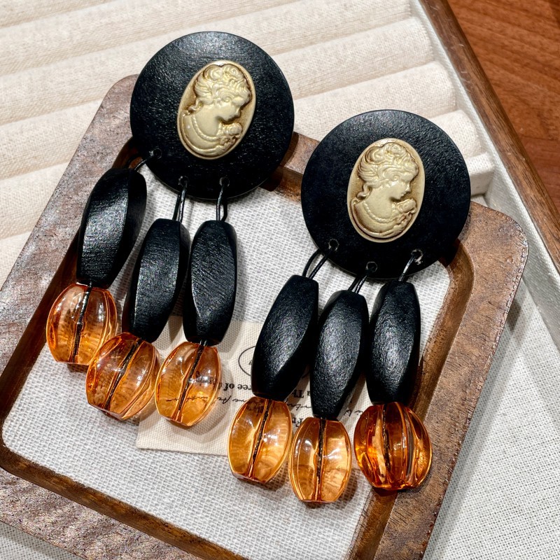 Lazy French Wooden Autumn and Winter Atmosphere Earrings Italian Retro High-End Queen Portrait Orange Glass Earrings