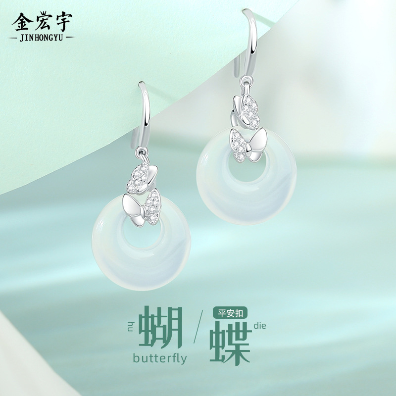New Chinese Butterfly Safe Buckle Earrings Women's 925 Sterling Silver Vintage National Style High-end National Fashion Ear Hook Chalcedony Earrings