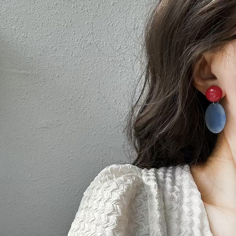 Blue Mist Geometric Circle Autumn and Winter Haze Blue Stylish Retro Hong Kong Style Earrings Jewelry Contrasting Color Earrings