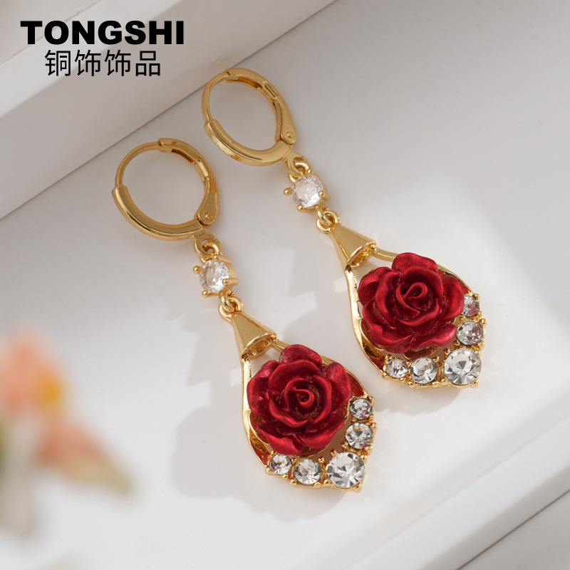 New Diamond-Encrusted Rose Light Luxury Earrings for Women, Fashionable and High-End Rose Pendants, Exquisite and Atmospheric Water Drop Earrings