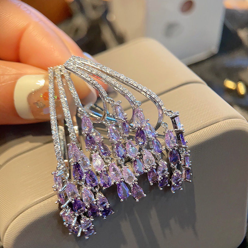 S925 Silver Needle Gradient Purple Zircon Earrings Olive Emerald Tassel Unique Design Earrings