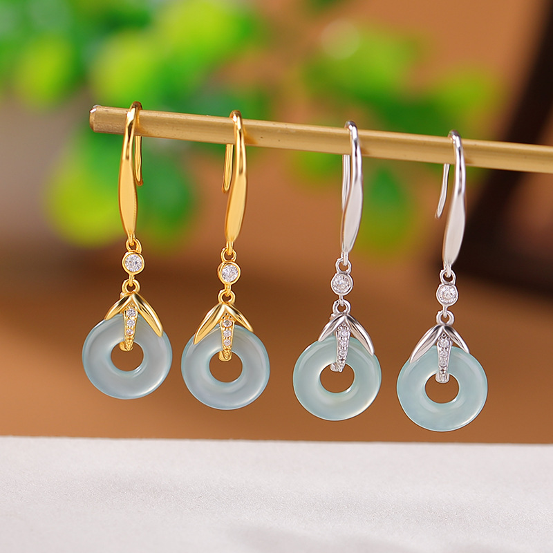 One Deer Silver S925 Sterling Silver Gold Plated Blue Water Jade Retro Bamboo Leaf Safe Buckle Earrings National Style Ear Hook