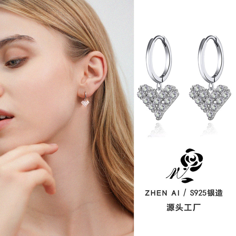 S925 sterling silver love earrings inlaid with zircon all-match ear buckle new fashion earrings ear hook Korean silver simple women