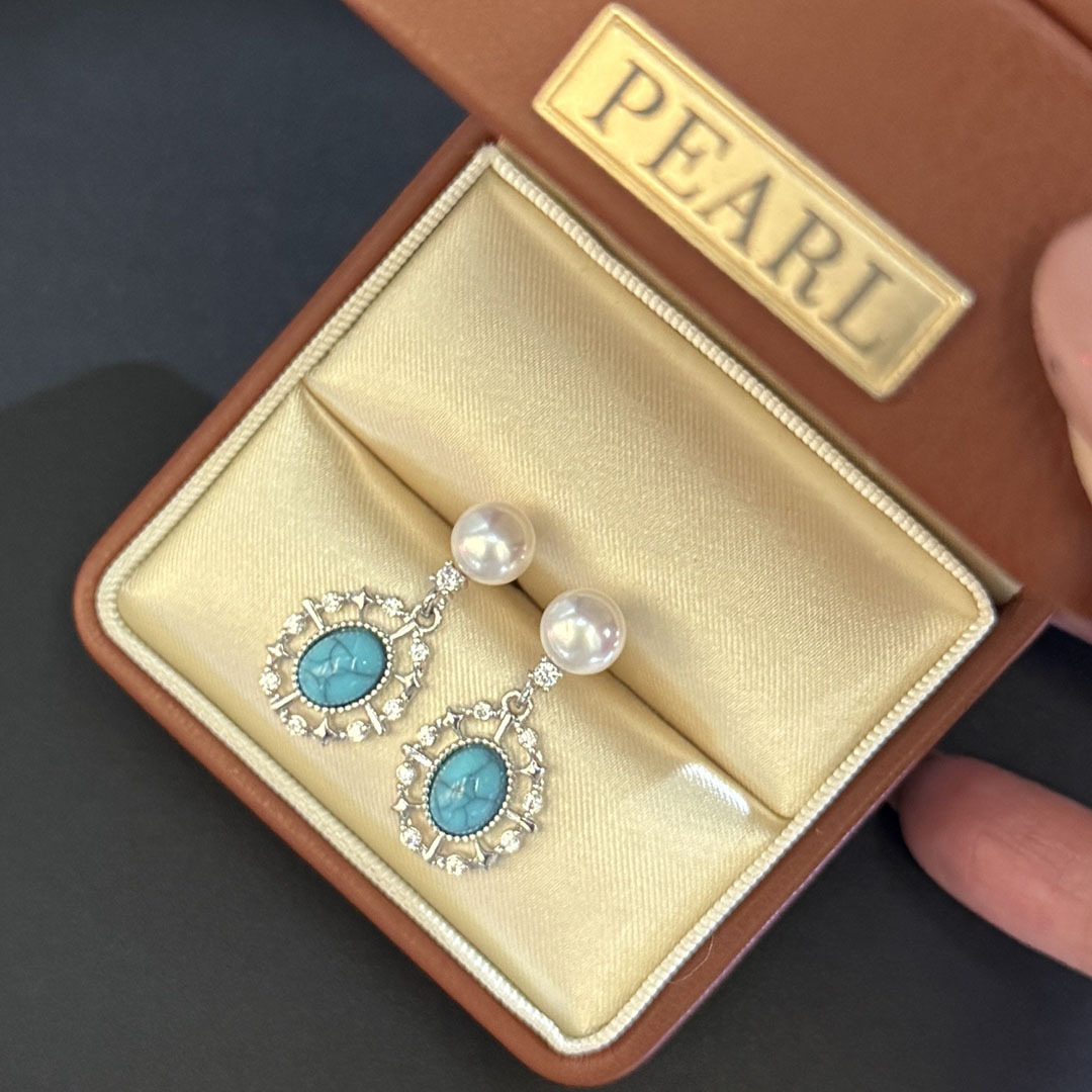 Retro Lace Natural Freshwater Pearl Earrings for Women S925 Silver Needle Accessible Luxury Oval Blue Turquoise Mother-Of-Pearl Pendant Earrings