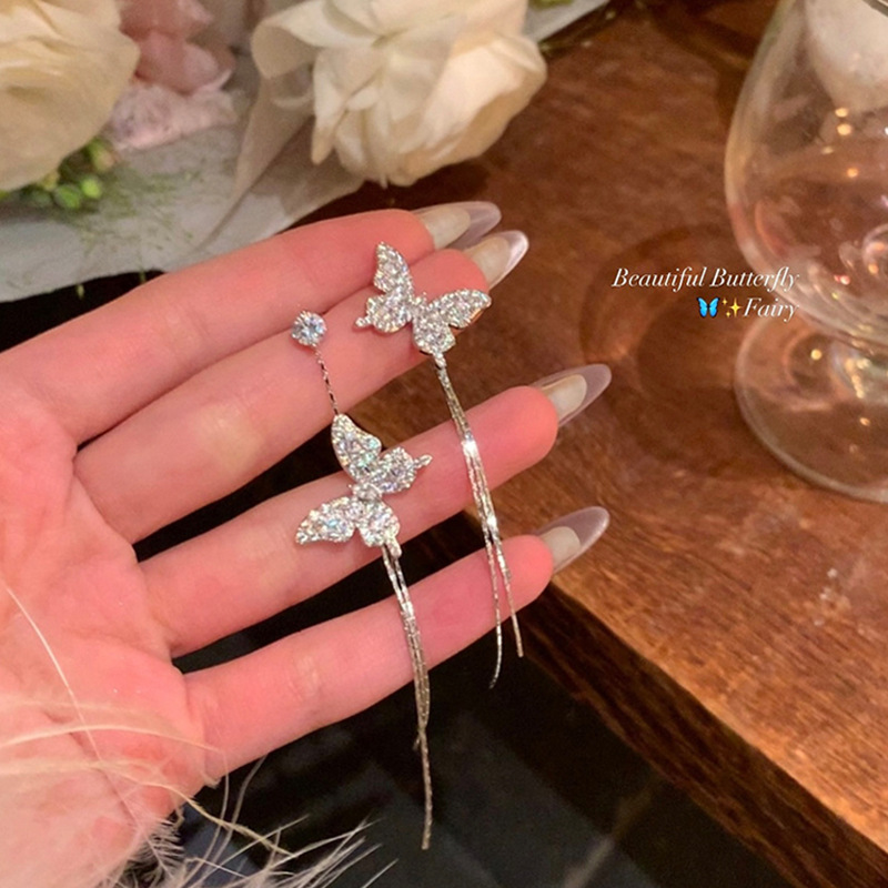 Super Flash Asymmetric Butterfly Tassel Earrings Women's Light Luxury Niche Design High-end All-match Long Earrings Ear Accessories