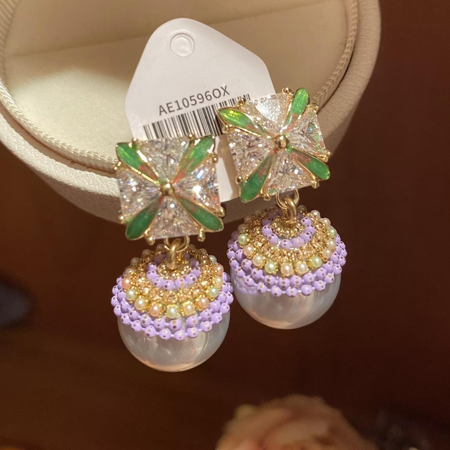 European and American Cross-Border Green Oil Drop Square Earrings Micro-Paved Zircon S925 Silver Needle Sweet Purple Pearl Tassel Earrings