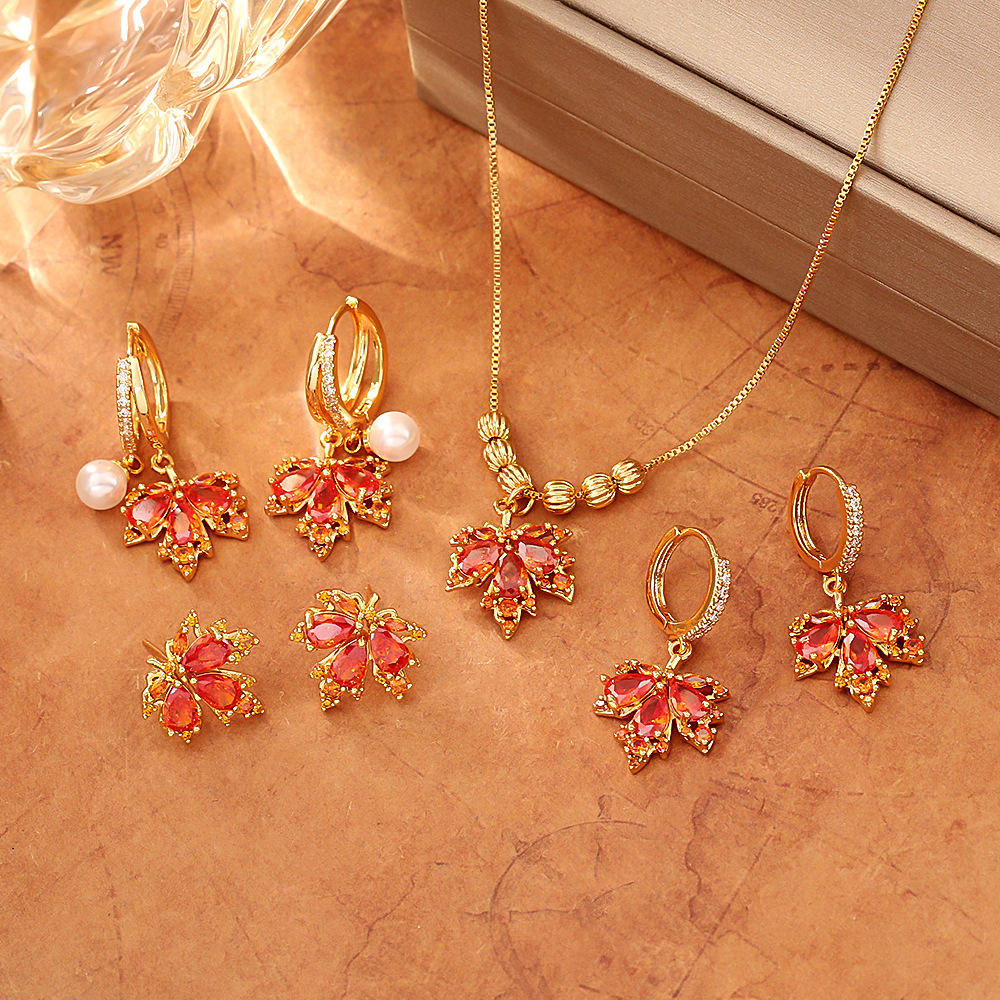 Micro-Paved Zircon Red Maple Leaf Earrings, High-End Autumn and Winter Popular Fashion Elegant Earrings, Elegant and Versatile Earrings for Women