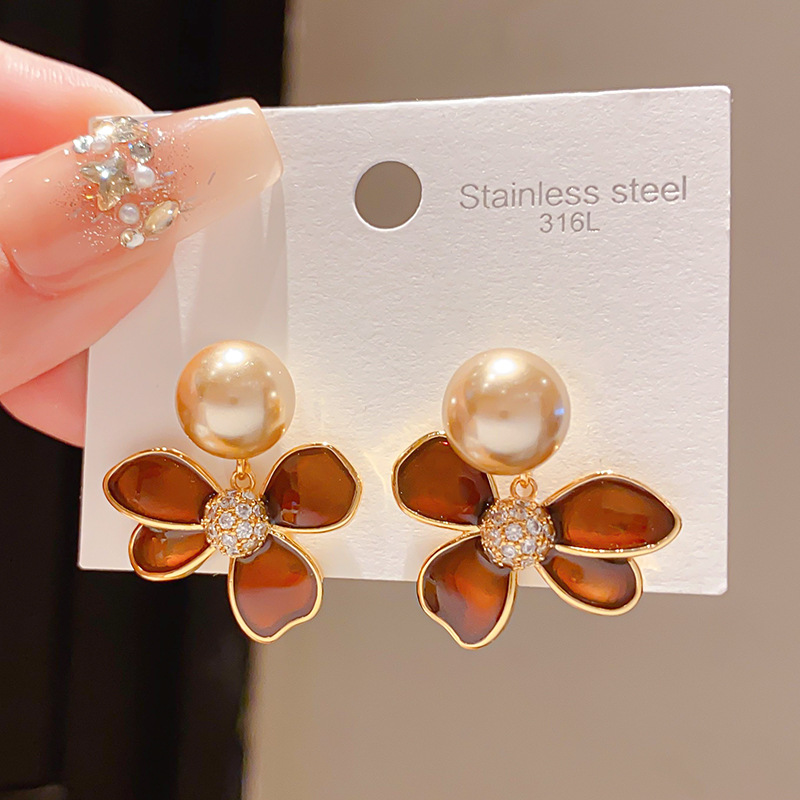18K Real Gold Electroplated Silver Needle Retro Oil-Dropped Zircon Pearl Flower Earrings Autumn and Winter Maillard Style High-End Earrings
