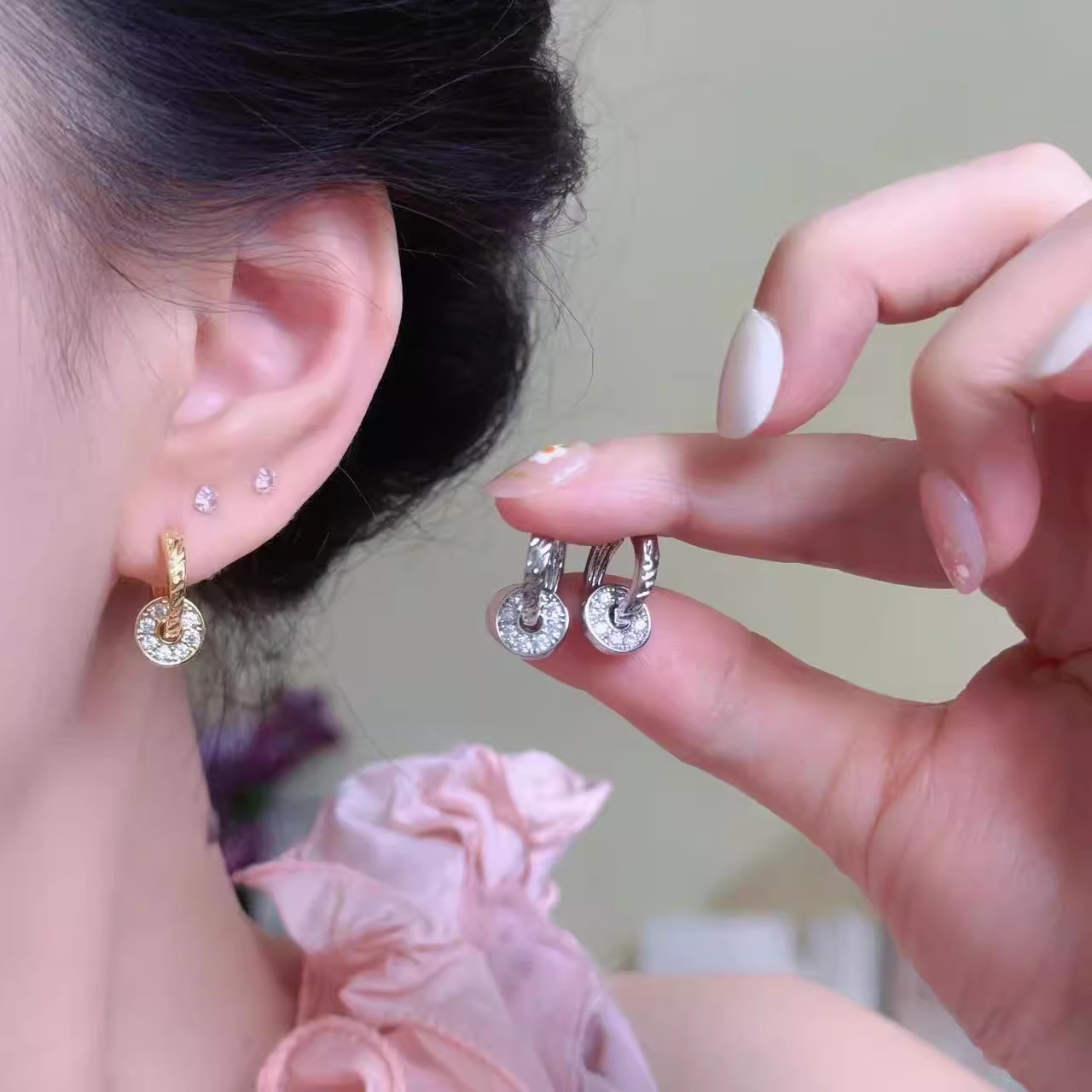 Korean-Style Micro-Inlaid Zircon Circle Texture Small Earrings for Women, Niche Light Luxury High-End Minimalist Earrings Jewelry