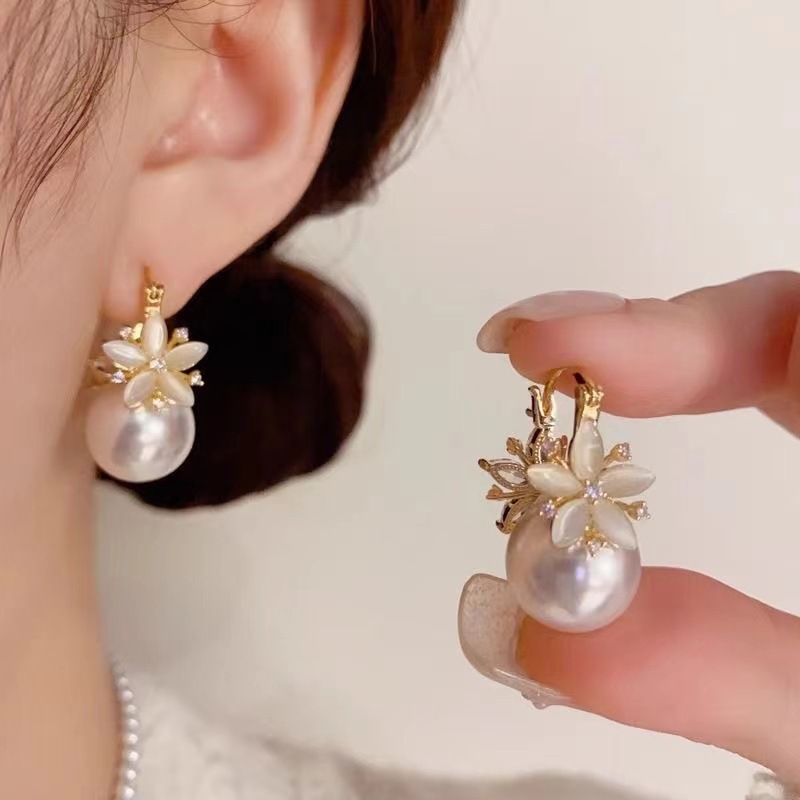 Korean-style Niche Design Sense Super Fairy Cat's Eye Stone Flower Pearl Earrings Fashion Exquisite Light Luxury All-match Ear Jewelry Women