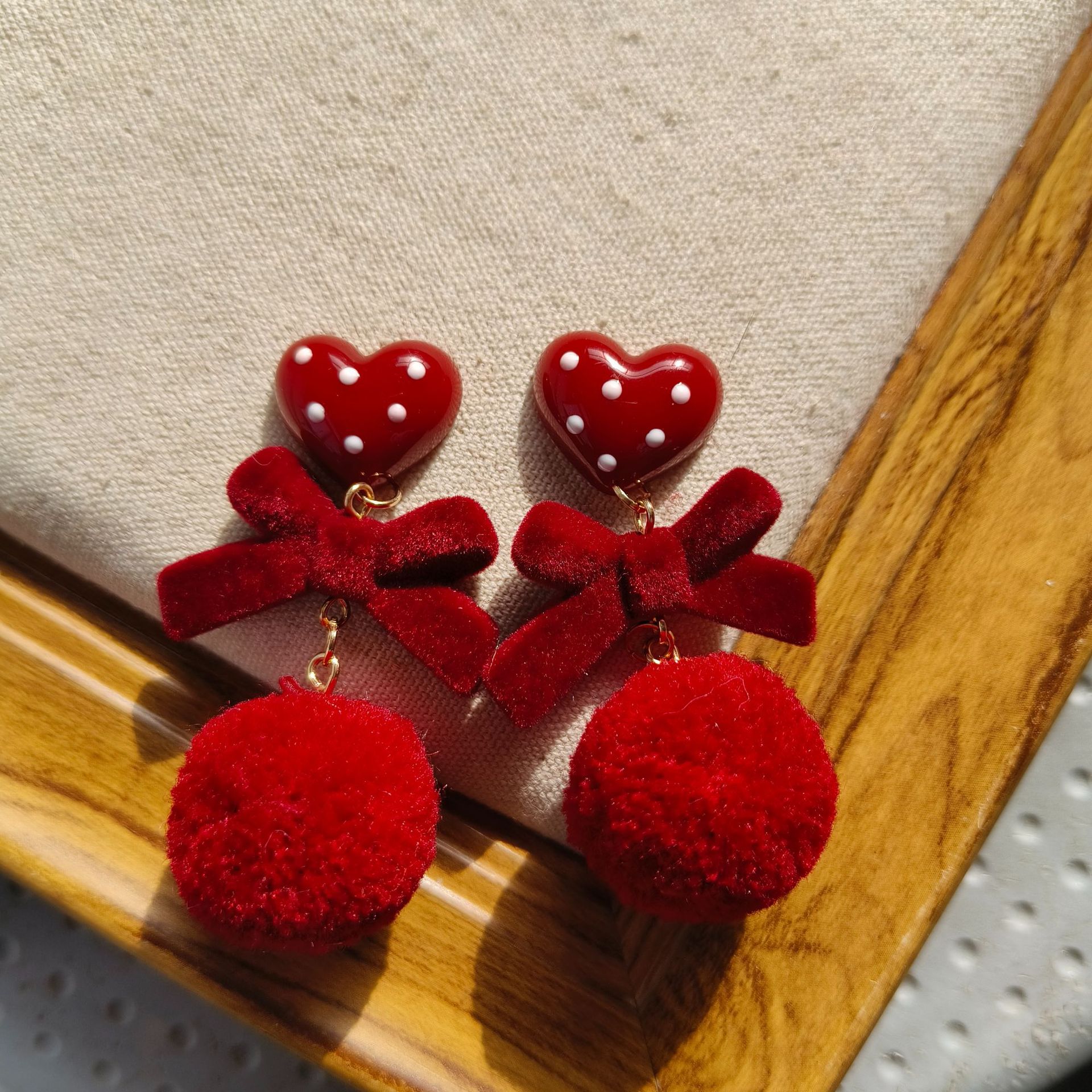Cute Japanese-Style Earrings Warm Plush Red Pom-Pom Earrings Polka Dot Heart Bowknot Girl Ear Clips