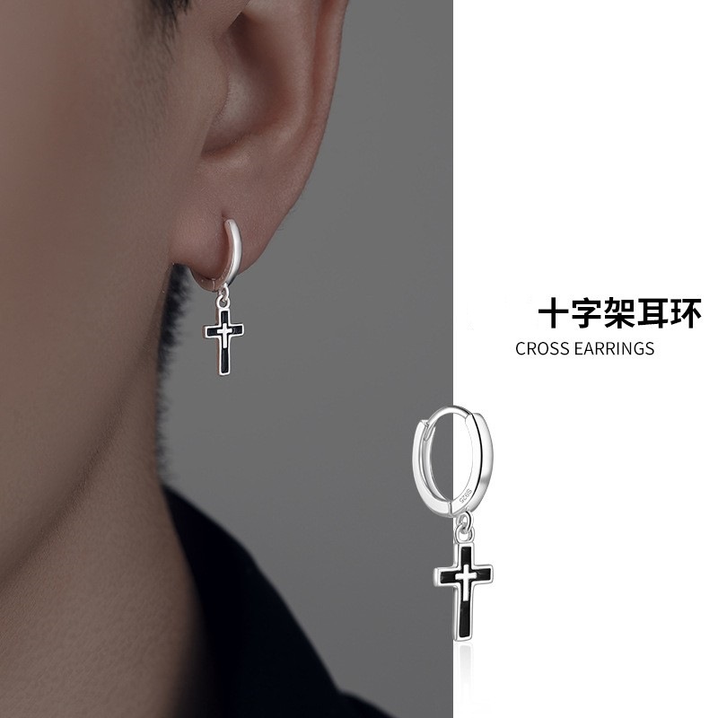 Silver-plated earrings men's high-grade simple black cross earrings single cold fashion brand all-match men's earrings