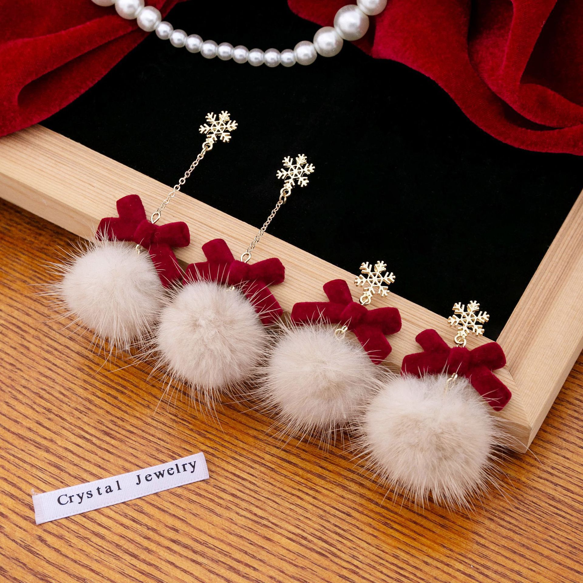 925 Silver Autumn and Winter Christmas Snowflake Hair Ball Long Tassel Chain Earrings Women's wine red Bow Flocking Earrings