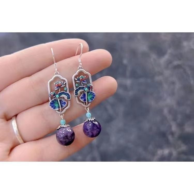 National Fashion New sterling silver earrings vintage cloisonne craft colored glaze lotus leaf natural purple dragon crystal silver earrings