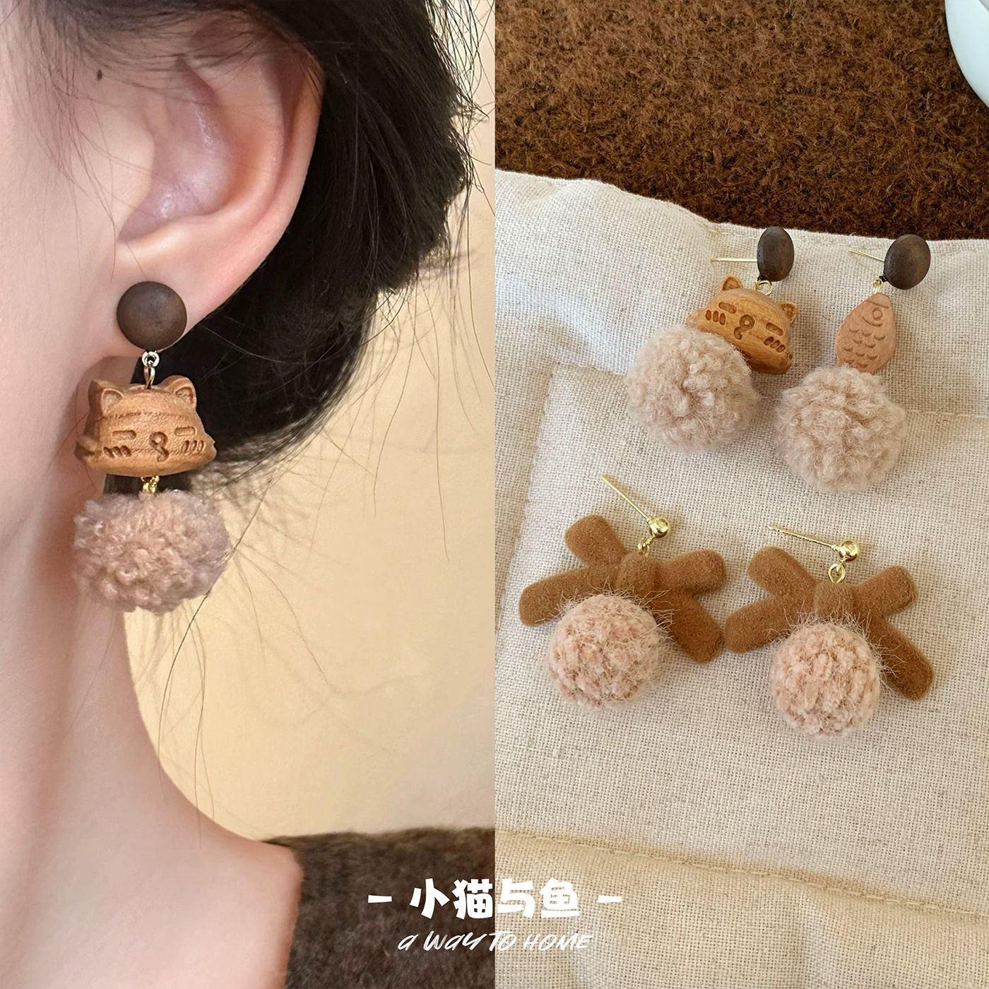 Winter Wooden Brown Cat Fish Hair Ball Earrings for Women Silver Needle Sweet Design Fun Cute Stereo Earrings