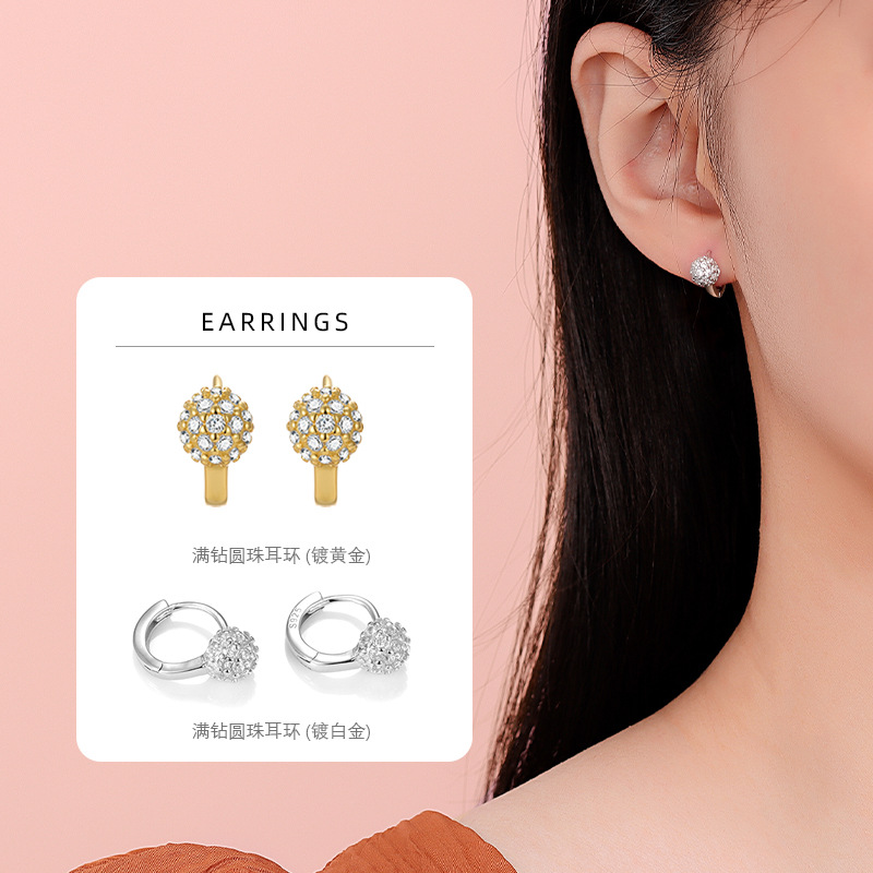 S925 Sterling Silver Full Diamond Round Bead Earrings Women's European and American Foreign Trade Cross-border Simple High-end Sense ins Style Ear Pole Ear Ring