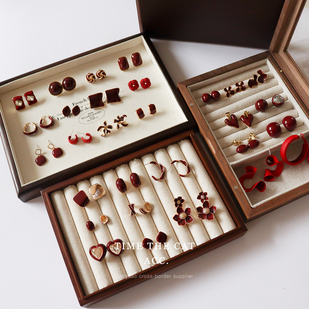French retro wine red earrings S925 silver needle C- shaped geometric temperament drop oil earrings autumn and winter New Year earrings for women