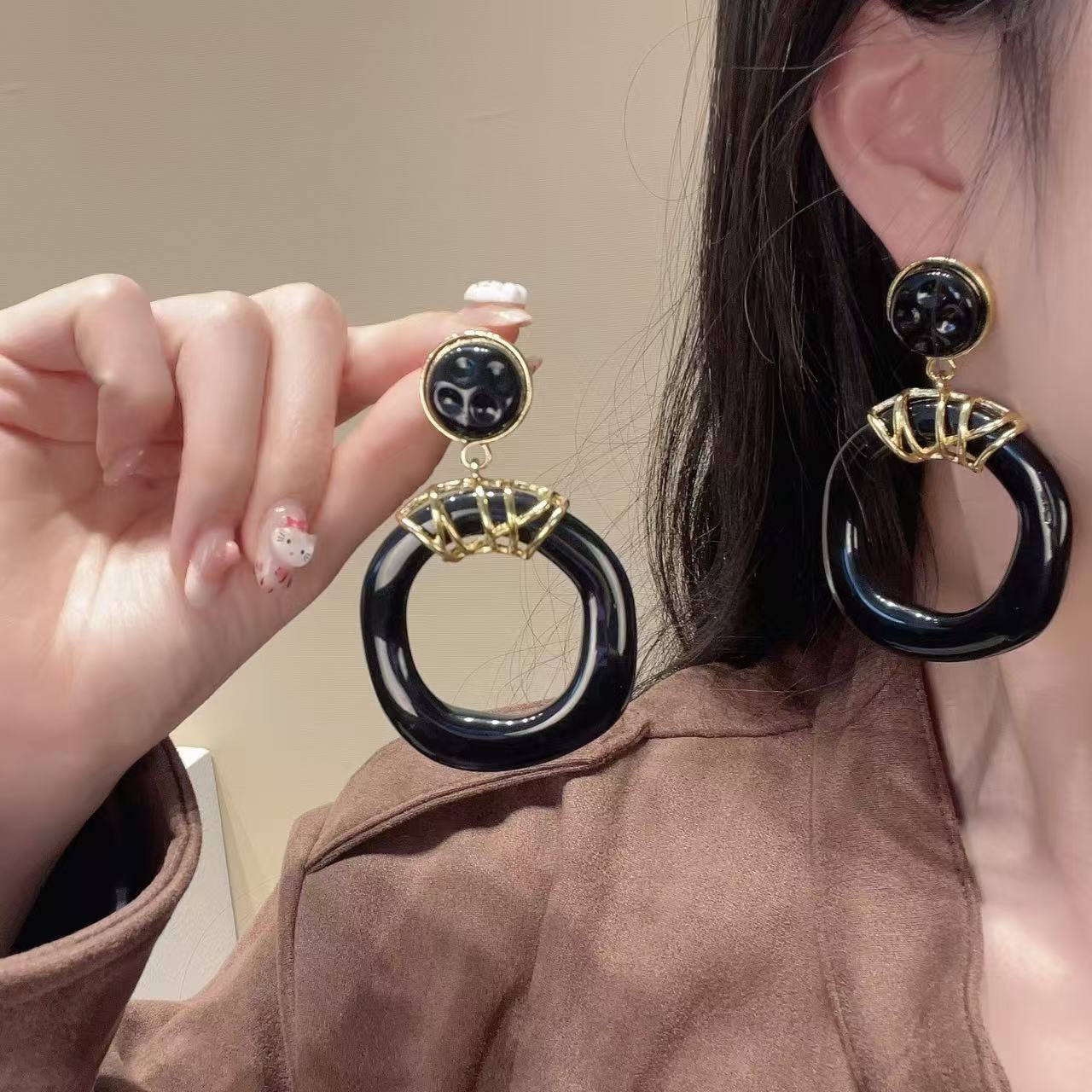 European and American French Medieval Asymmetrical Round Resin Earrings Retro Accessible Luxury High-End Black Gold Hoop Earrings for Women