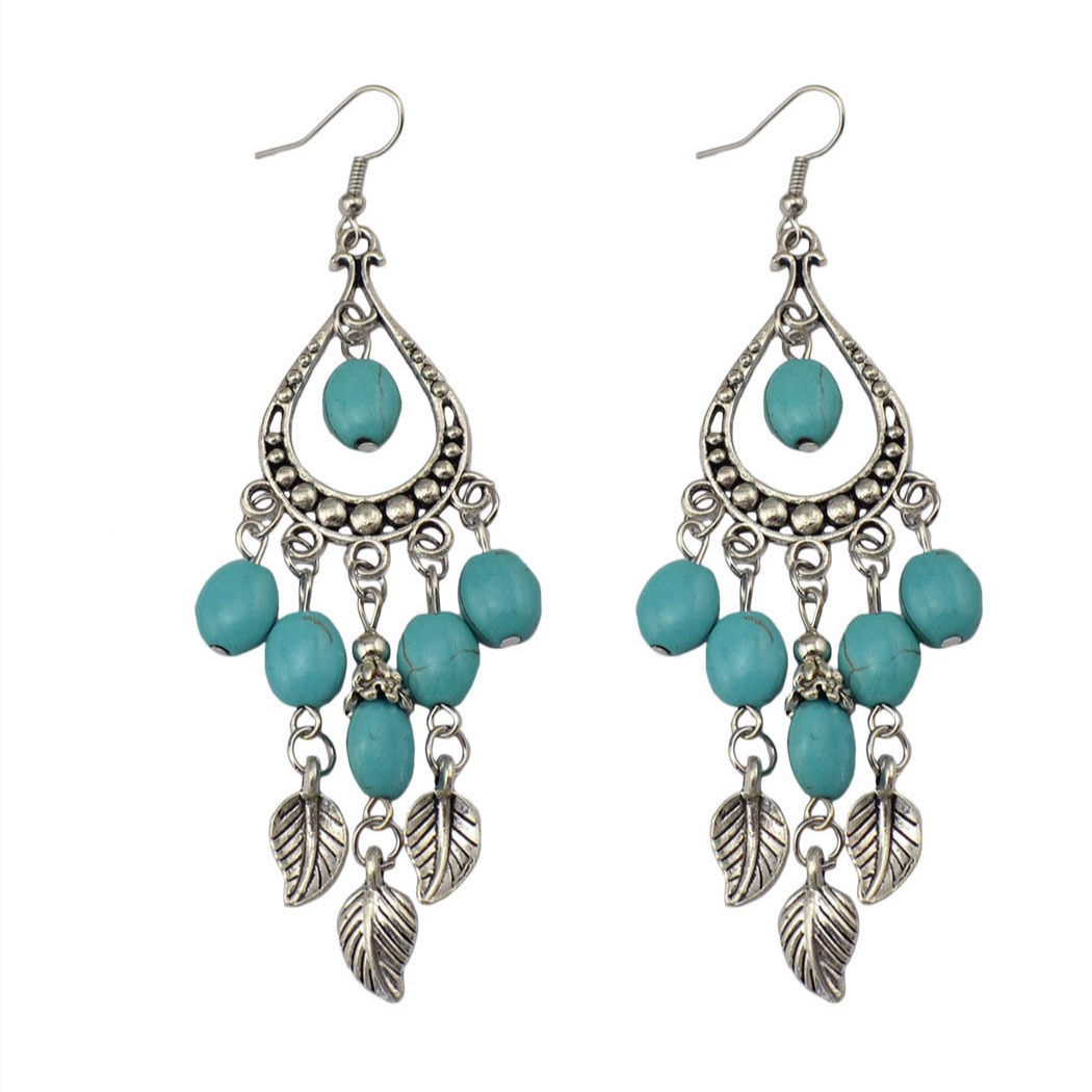 European and American Jewelry Ethnic Style Small Leaf Branch Tassel Turquoise Long Drop-Shaped Earrings