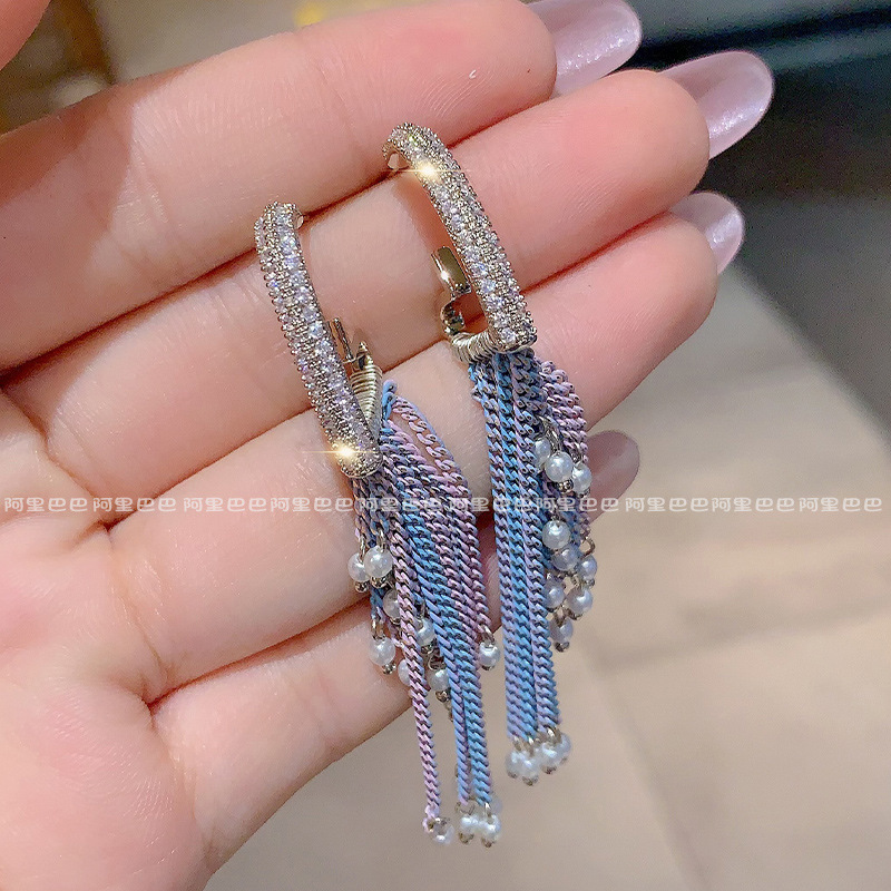 New Retro Fashion Long Tassel Earrings Women's High-end Western Style Diamond-encrusted Silver Pin All-match Internet Celebrant Round Face Earrings