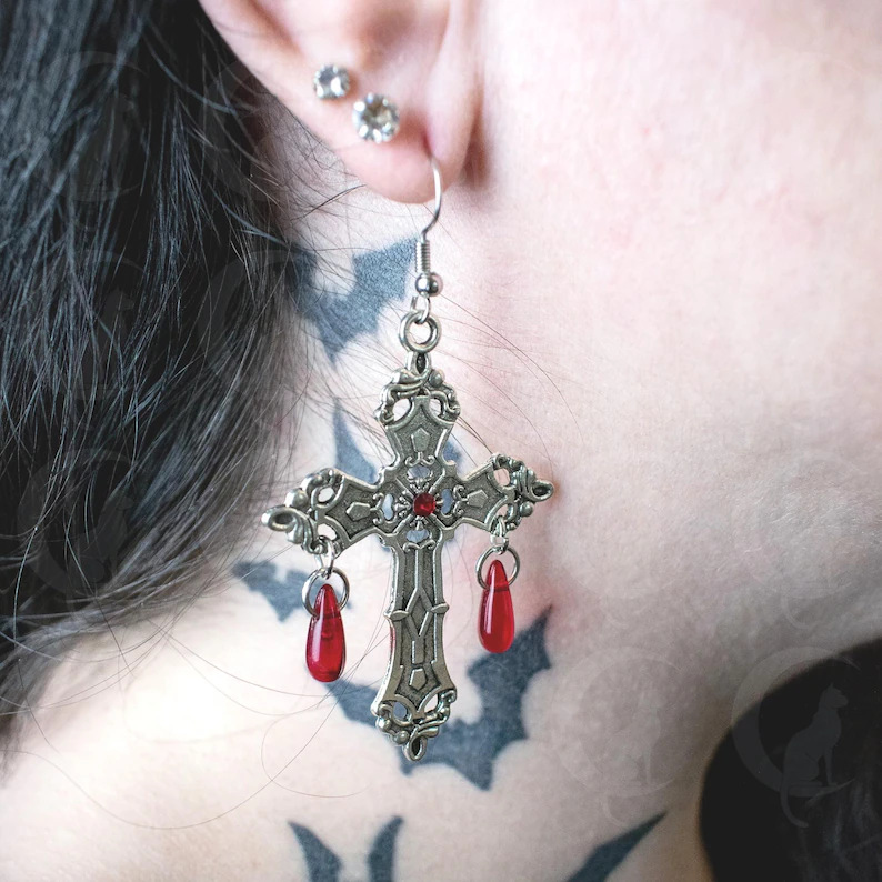 Gothic Vampire Cross Earrings: Silver Alloy, Red Czech Glass Personalized Dark Pendant Earrings