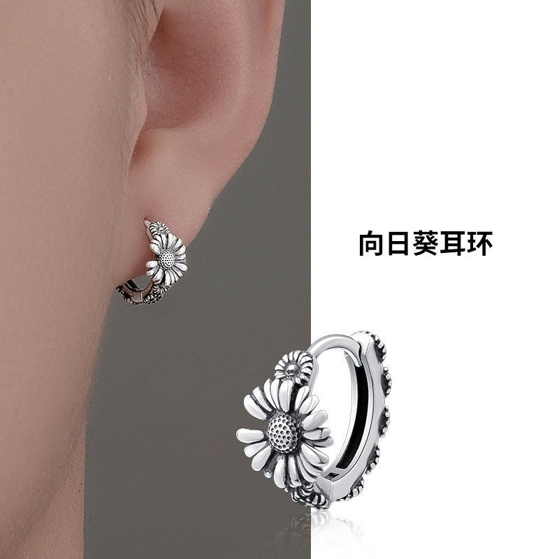 Xinqi Jewelry Sunflower Daisy Earrings Men's Retro Old Cold Style Fashion Imitation Thai Silver Flower Ear Buckle