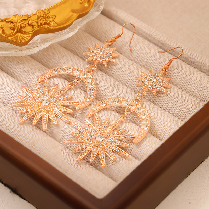 Cross-Border European and American Exaggerated Retro Fashion Star and Moon Earrings for Women Double-Layered Six-Pointed Star Diamond Shiny Earrings Wholesale