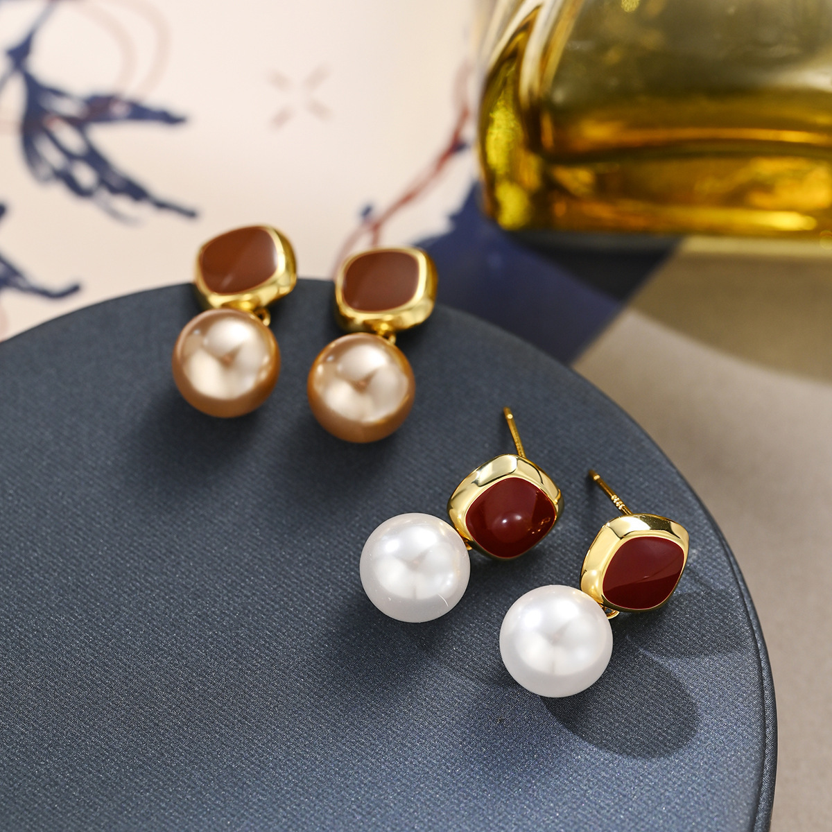 Fashionable French Style Vintage An Red Enamel Oil Drop Earrings Autumn and Winter Hong Kong Style High-grade Pearl Earrings S925 Silver Needle